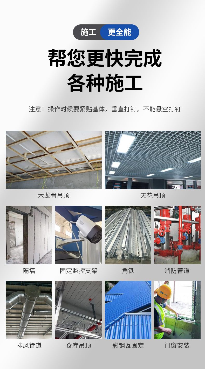 适用场景:车库管道安装、吊顶安装、木板固定安装、排风管道安装、空调内机安装、消防管道安装